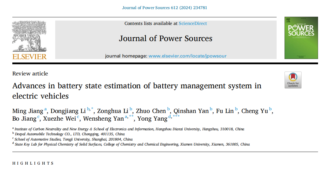 近日,我院姜茗特聘副教授在国际TOP期刊Journal of Power Sources上发表关于新能源电动汽车电池管理系统(BMS)电池状态评估进展方面的综述研究论文。其中,杭州电子科技大学(电子信息学院&杭电碳中和新能源研究院)为该论文第一单位,姜茗老师为第一作者。