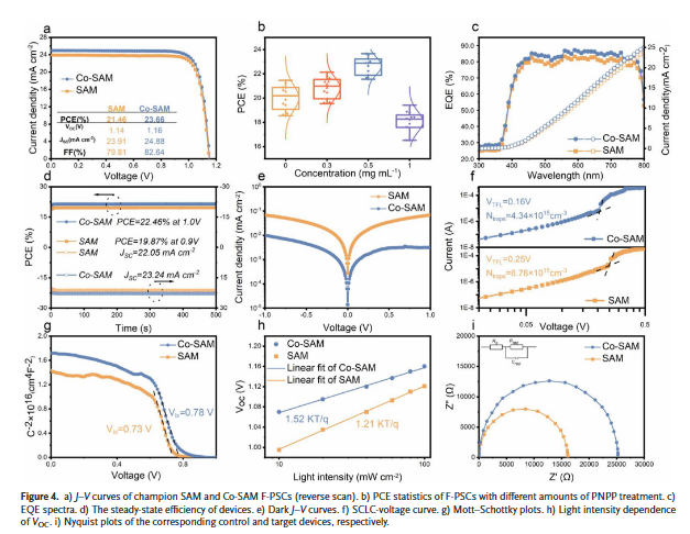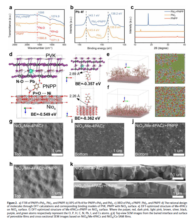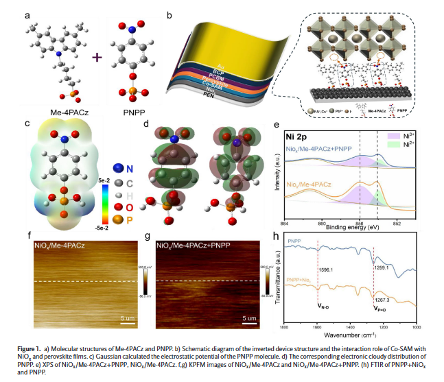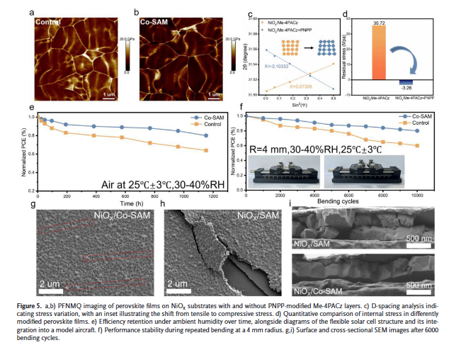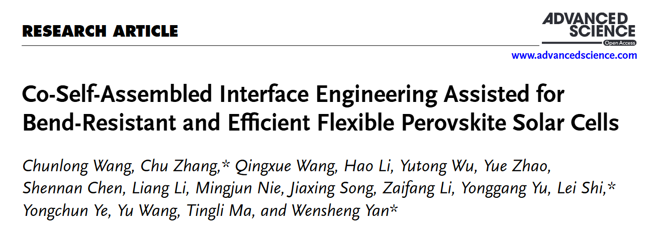 近日,我院严文生团队与中国计量大学张楚团队在柔性钙钛矿电池展开的科研合作,在国际TOP期刊Advanced Science上发表。众所周知,柔性钙钛矿太阳能电池(F-PSCs)因其优越的机械柔性而引起了广泛关注,具有极高的产业化应用和商业化价值。然而,在柔性钙钛矿电池器件中,隐蔽的底界面缺陷阻碍了光伏器件性能的进一步提升。在本研究工作中,我们通过将4-硝基苯基磷酸酯(PNPP)引入[4-(3,6-二甲基-9H-咔唑-9-基)丁基]膦酸(Me-4PACz),实现了共自组装单分子层(Co-SAM)工程策略,从而改善NiOx/钙钛矿(PVK)界面。该技术不但提高了NiOx/Me-4PACz的表面均匀性和亲水性,同时也促进了PVK晶体取向的有利生长。此外,PNPP有效缓解了NiOx表面及其下方PVK的缺陷生成,最终显著提升了界面电荷传输效率。结果,F-PSCs的器件效率从21.46%提升至23.66%。由于在 PVK 内部应力分布更均匀以及 NiOx/PVK 界面处的粘附力更强,即使经过 10,000 次弯曲循环,F-PSCs 仍保持了原始效率的80%。从环保角度,PNPP 展现了出色的捕捉 PbI2的能力,有助于在器件运行条件下减少铅泄漏,增大了具备环境友好的技术特色。