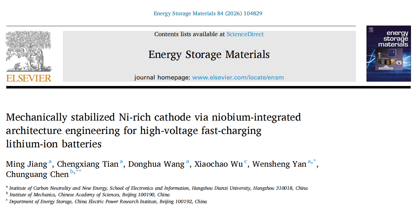 近日,杭电电子信息学院/碳中和新能源研究院严文生&姜茗老师在国际顶刊《EnergyStorageMaterials》上发表高压快充锂电池研究成果。题目为“Mechanically Stabilized Ni-Rich Cathode via Niobium-Integrated Architecture Engineering for High-Voltage Fast-Charging Lithium-Ion Batteries”。《EnergyStorageMaterials》是中科院TOP一区期刊,影响因子20.2。本研究工作通过创新的“铌整合”架构工程结合颗粒细化策略,成功设计并制备出一种机械稳定性显著增强的高镍层状正极材料,为解决高镍材料在高电压下的结构衰退与界面失稳难题提供了有效的多功能协同稳定方案。论文第一作者为姜茗特聘副教授,通讯作者为严文生教授、中科院力学所陈春光研究员。
