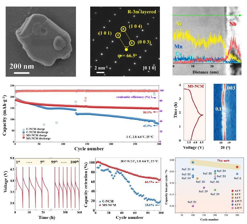 高镍层状正极材料(如LiNi0.8Co0.1Mn0.1O2)是提升锂离子电池能量密度的关键,但在>4.3 V的高电压下,材料面临严重的各向异性晶格应变、微裂纹产生及界面副反应,导致容量快速衰减,限制了其在高压快充场景中的应用。本研究融合了颗粒精细化与表面铌酸锂修饰,构建了一种具有梯度铌分布的“铌整合”表面结构。研究表明,该设计从三个层面协同发挥作用:首先, MS-NCM颗粒表现出更高的杨氏模量与硬度,增强了颗粒的机械性能,有效抑制了深度脱锂时的晶格应变与微裂纹的产生;其次,表面铌掺杂扩大了晶格通道,优化了锂离子扩散动力学行为,使材料能够承受高达20 C的极端快充;最后,改性诱导形成了富含LiF的稳定正极电解质界面膜(CEI),极大抑制了界面阻抗的增长。电化学测试结果显示,MS-NCM在2.8-4.6 V高压条件下循环300次后,容量保持率高达80.4%,且在20C快充下仍展现出优异的耐久性。同步进行的原位电化学分析与热稳定性测试进一步验证了其结构应变与热失控风险的显著降低,这项工作为攻克下一代高能量密度、高功率密度锂离子电池正极材料的关键瓶颈提供了新的解决思路并奠定了理论基础。