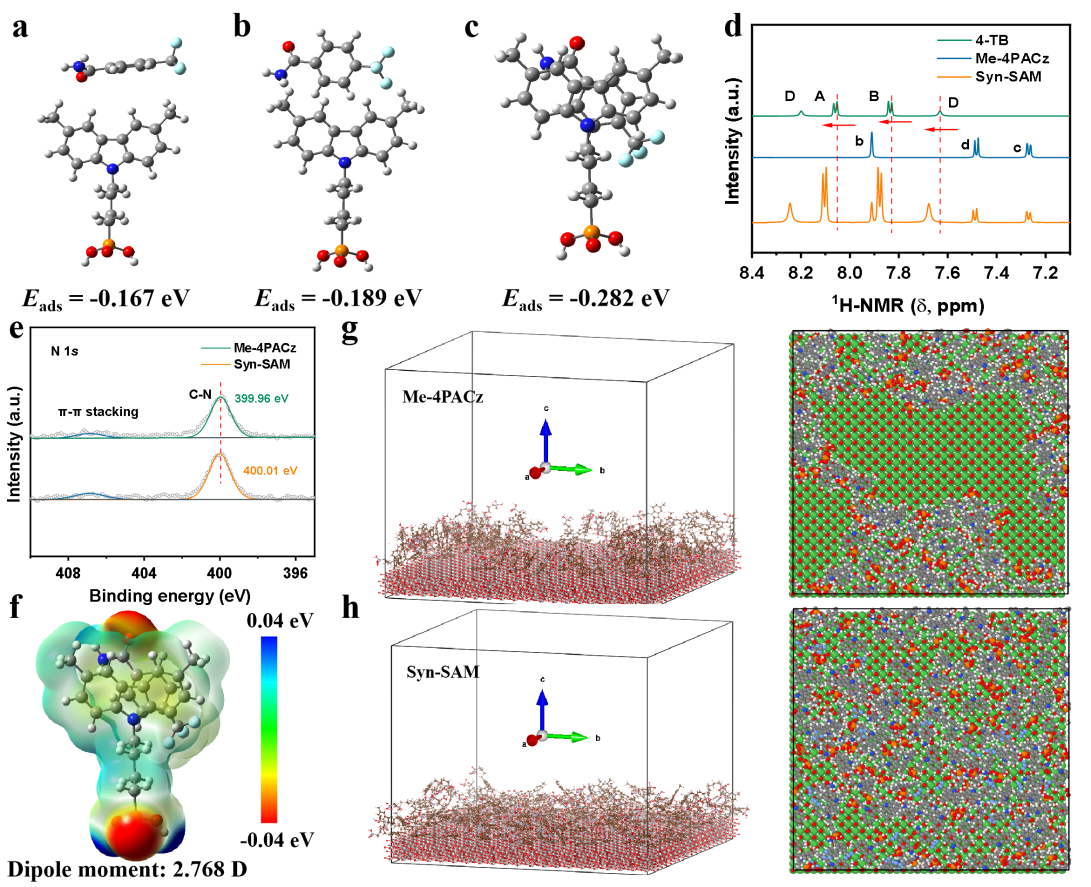 针对该类电池空穴传输层中自组装单分子(SAM)材料分布不均、易导致钙钛矿薄膜质量下降的关键难题,研究团队提出了一种协同自组装单分子(Syn-SAM)策略。在NiOx/Me-4PACz复合空穴传输层基础上,创新性地引入4-三氟甲基苯甲酰胺(4-TB)分子,它与经典的Me-4PACz分子共组装形成协同SAM。研究发现,4-TB分子的苯环能与Me-4PACz产生强烈的π-π堆叠相互作用,诱导二者形成有序的平行堆叠结构,这不仅增强了界面偶极,还使其中的羰基官能团能够有效钝化钙钛矿底部的未配位铅离子缺陷。这种协同效应显著提升了钙钛矿薄膜的结晶质量,并大幅抑制了埋底界面处的非辐射复合损失。