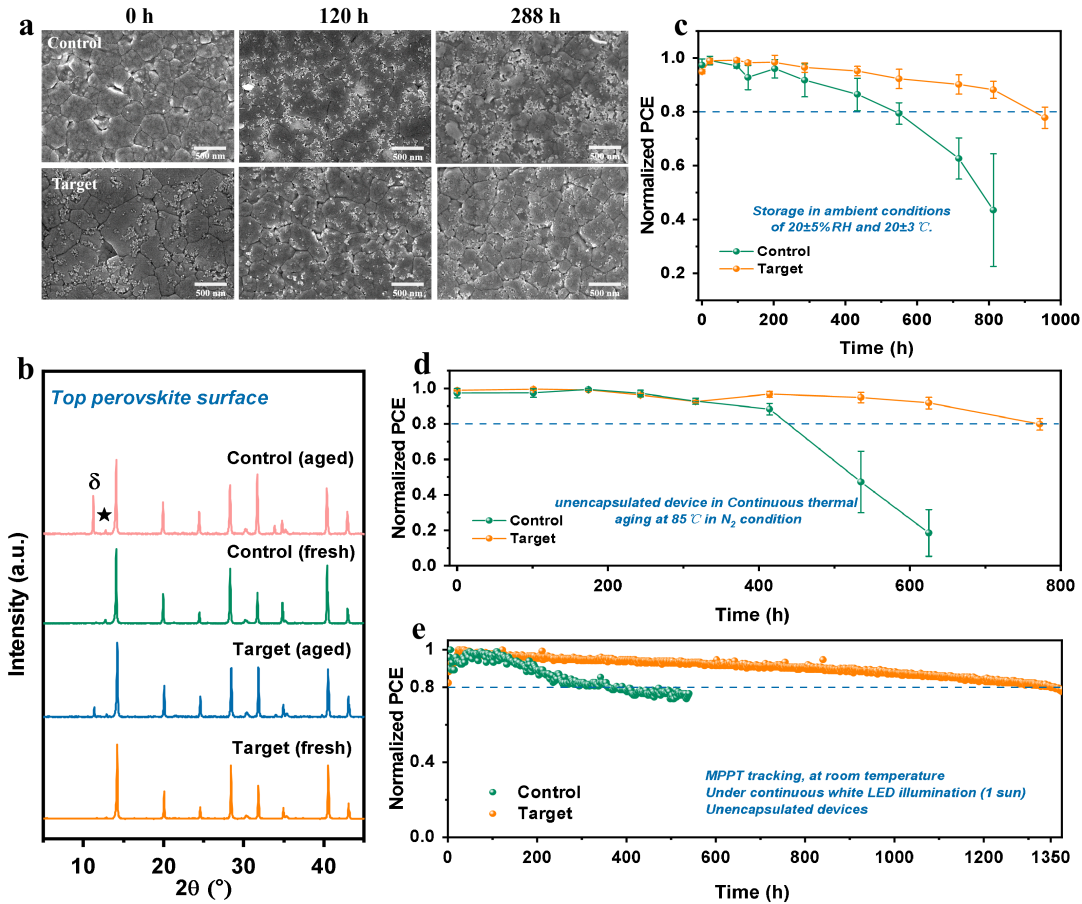 得益于协同SAM策略对钙钛矿埋底界面的精准优化,基于该策略制备的倒置钙钛矿太阳能电池实现了25.27%的光电转换效率,开路电压高达1.194 V。同时,器件展现出优异的运行稳定性,在85℃高温老化770小时后及持续光照超过1300小时后均能保持良好的稳定性。该协同SAM策略在宽带隙(1.82 eV)钙钛矿太阳能电池中也取得了19.44%的效率,展示了其良好的普适性,为提升钙钛矿光伏器件性能与稳定性提供了新的设计思路。
