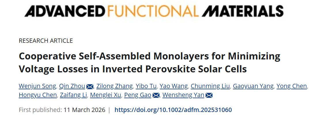 近日,我校电子信息学院/碳中和新能源研究院2024级研究生宋稳君以第一作者身份在材料领域顶级期刊《Advanced Functional Materials》(IF=19)上发表题为“Cooperative Self-Assembled Monolayers for Minimizing Voltage Losses in Inverted Perovskite Solar Cells”的研究论文,通讯作者为周勤特聘副教授、严文生教授以及中国科学院福建物质结构所高鹏研究员,杭州电子科技大学为第一署名单位。